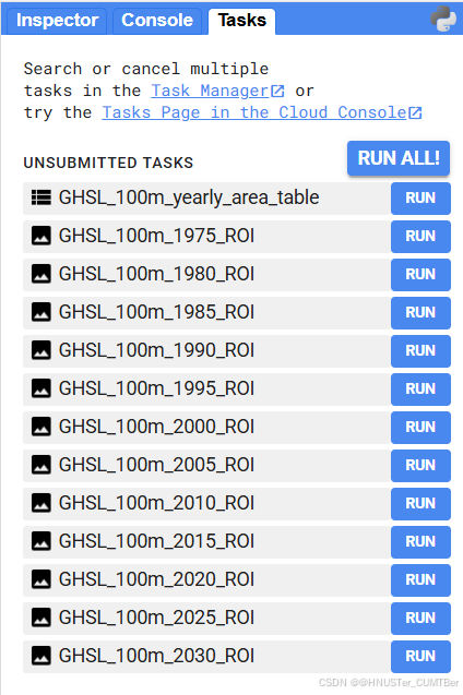 - 运行代码后,在 GEE 界面右上角 “Tasks” 面板会出现一个名为 “GHSL_100m_yearly_area_table” 的任务;