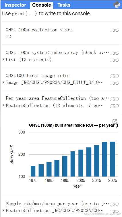 ghsl100.size():输出影像数量(如 10 代表包含 10 个年份的数据),若为 0,说明 ROI 范围内无该数据集覆盖(如高纬度无人区),需检查数据集版本或 ROI 范围;ghsl100.aggregate_array('system:index'):输出各影像的年份索引(如["2000", "2005", "2010"]),明确可用年份,避免后续计算时调用不存在的年份;ghsl100.first():输出首张影像的元数据,关键查看system:time_start(时间戳,用于后续提取年份)、crs(投影坐标系,如EPSG:4326)、bands(波段信息,确认built_surface波段存在)。