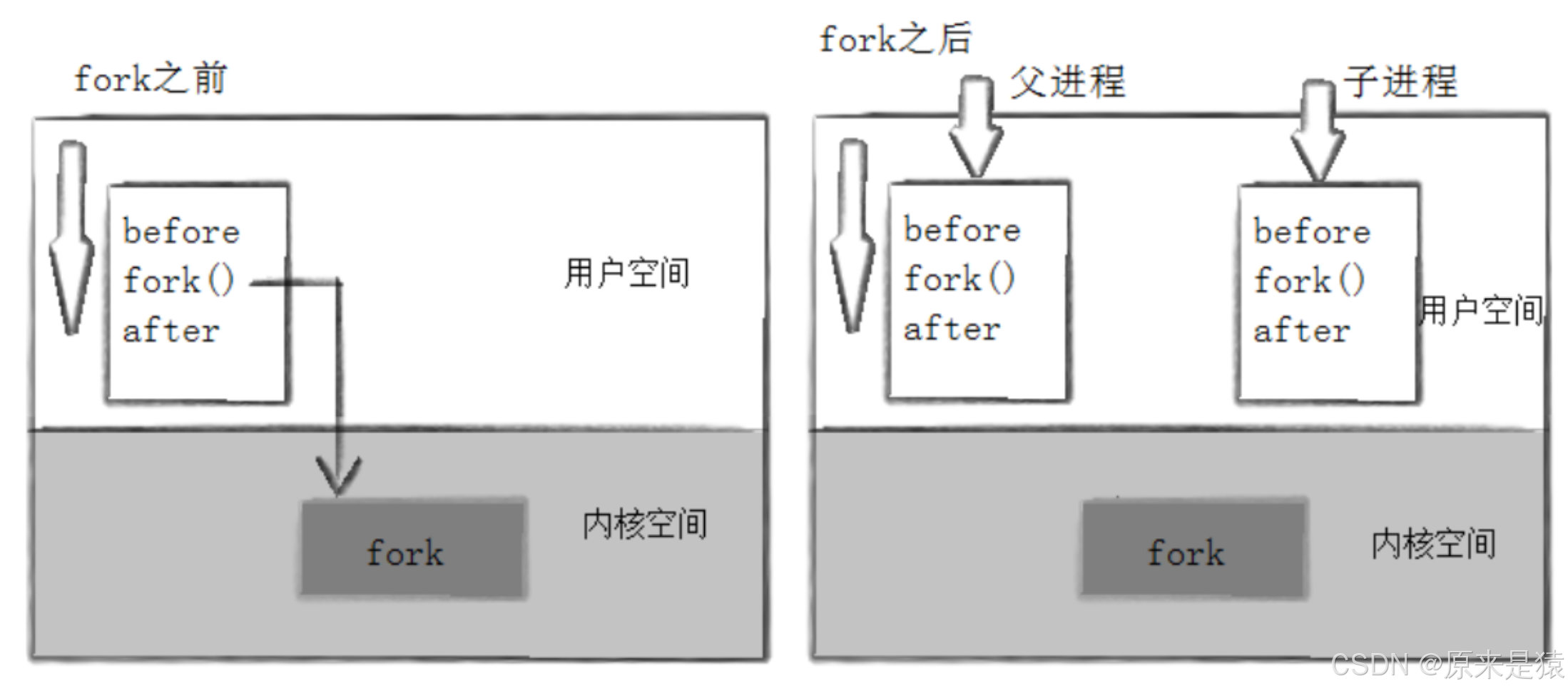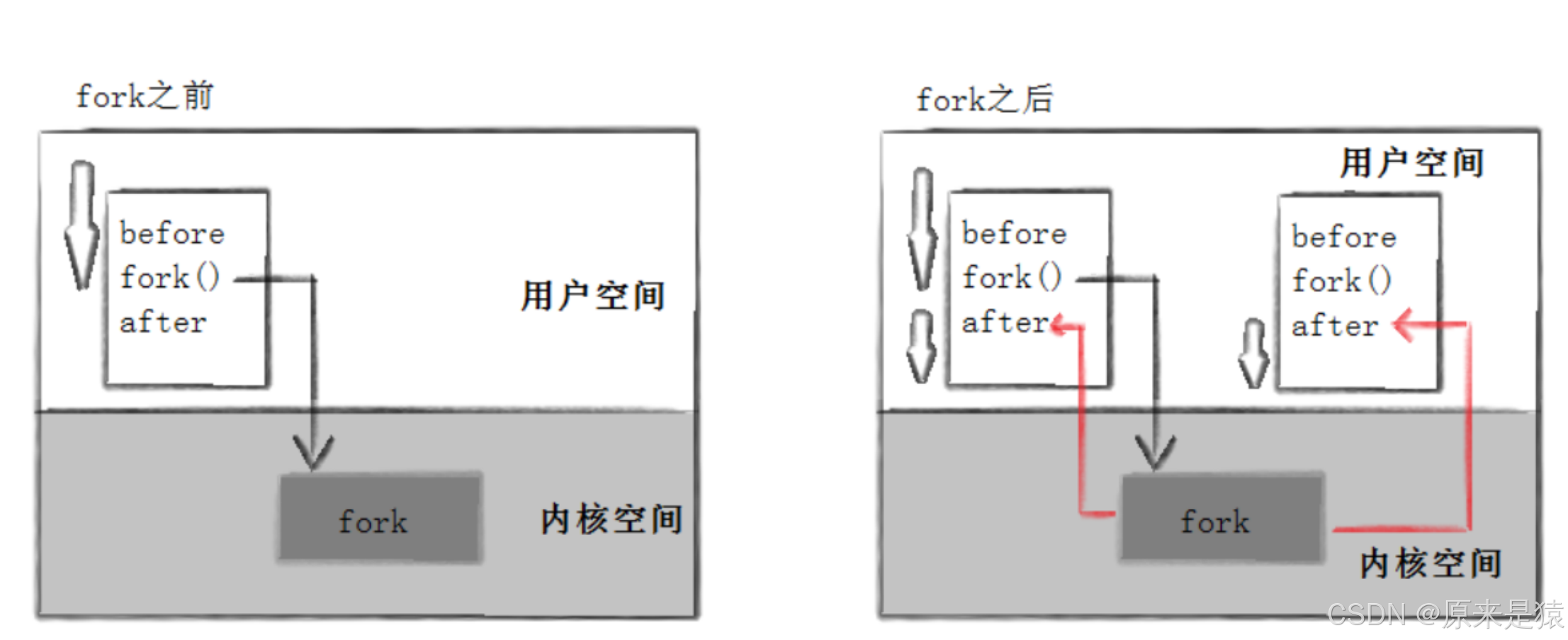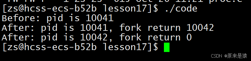 fork调用之前,只有父进程在执行,所以 “Before” 只输出一次;fork调用之后,父进程和子进程各自独立执行,所以 “After” 会分别在两个进程中输出。而且,父进程中fork返回的是子进程的 ID(10042),子进程中fork返回的是 0。