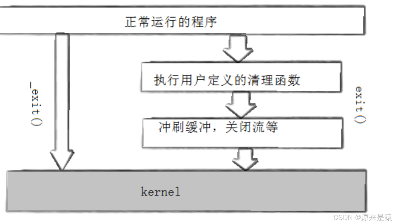 2)调用exit函数。exit函数会先执行用户通过atexit或on_exit函数注册的清理函数,然后关闭所有打开的文件流,将缓存数据写入文件,最后调用_exit函数终止进程。它的定义如下: