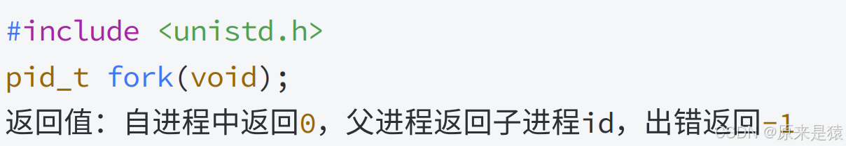 {pid_t pid;printf("Before: pid is %d\n", getpid());if ((pid = fork()) == -1) {perror("fork()");exit(1);}printf("After: pid is %d, fork return %d\n", getpid(), pid);sleep(1);return 0;