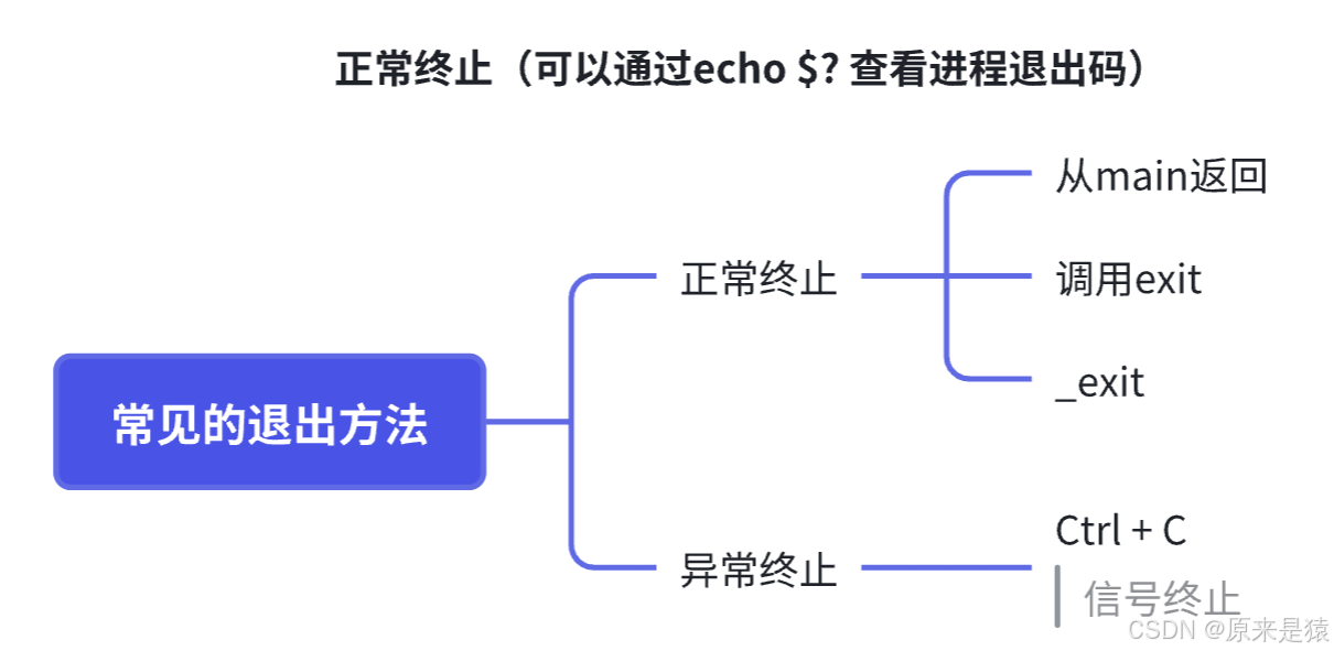 1)main函数中返回 : main函数的返回值就是进程的退出码,比如return 0表示进程正常退出,return 1表示进程异常退出。