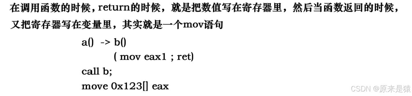 “mov语句” 是汇编层面的指令,意思是 “把数值从一个地方移动到另一个地方”。比如函数b()执行return 1,汇编指令会是 mov eax, 1(把1放到eax寄存器里);当a()调用b()后,会执行 mov 0x123, eax(把eax里的1移动到a()里的变量0x123对应的内存中).