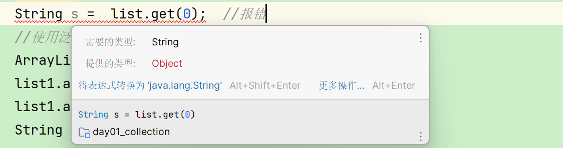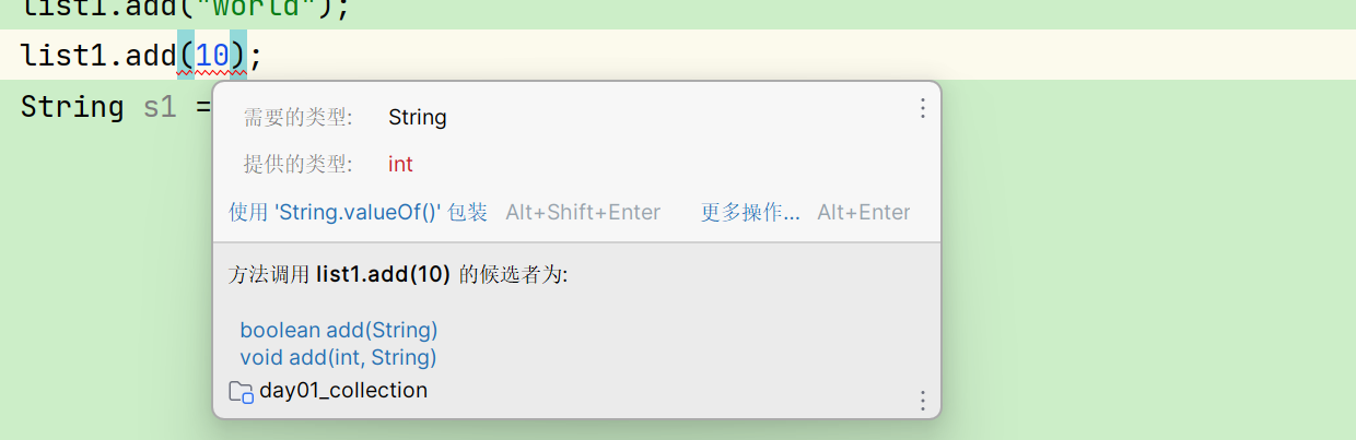 上面的代码使用了泛型后只能添加相应的类型,如果加其他类型报错,报错信息如下: