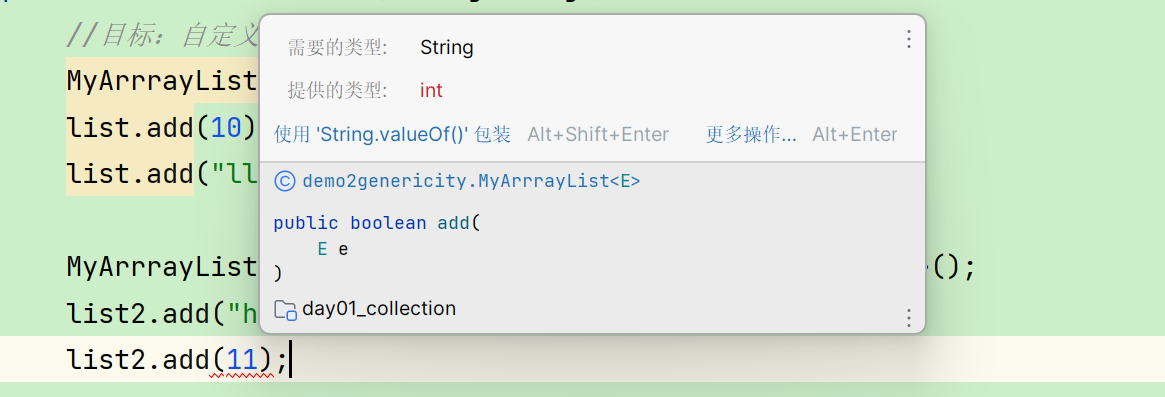 public class GenericDemo2 {public static void main(String[] args) {//目标:自定义泛型类MyArrrayList list = new MyArrrayList();list.add(10);list.add("ll");MyArrrayList <String> list2 = new MyArrrayList<String>();list2.add("hello");//list2.add(11); //报错}