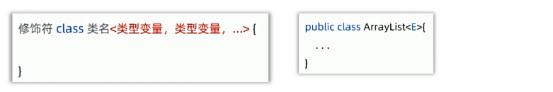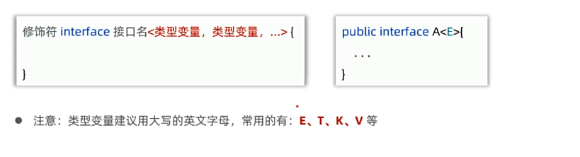 注意:类型变量建议用大写英文字母,常用的有E(一般代表数据类型)、T(一般代表返回值类型)、K、V(一般代表值类型)。