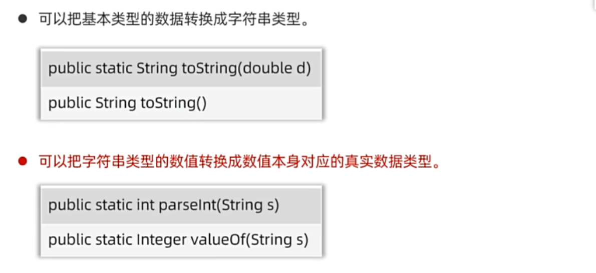 public class enericDemo9 {public static void main(String[] args) {//包装类的基本功能//把基本类型转为字符串//方法一int a = 10;String s = a + "";System.out.println(s);//方法二double b = 10.3;String str = Double.toString(b);System.out.println( str);//方法3:Integer i = new Integer(10);String s1 = i.toString();System.out.println(s1);System.out.println("------把字符串转化为真实类型------");//方法一String s2 = "10";int a1 = Integer.parseInt(s2);System.out.println(a1 + 1);//方法二String s3 = "10.1";double a2 = Double.valueOf(s3);System.out.println(a2 + 1);}