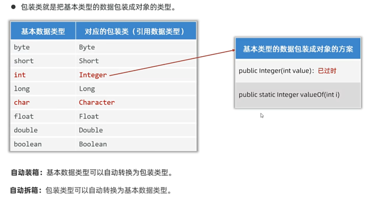 import java.util.ArrayList;public class enericDemo8 {public static void main(String[] args) {//包装类//手工包装Integer i = new Integer(10); //在JDk9 之后,被弃用Integer i1 = new Integer(10);System.out.println(i == i1);Integer i2 = Integer.valueOf(10);//推荐 -128 -127 之间的数字是被缓存的如果定义多个相同的变量,不会创建新的对象Integer i3 = Integer.valueOf(10);System.out.println(i2 == i3); // trueSystem.out.println(i == i3); //falseSystem.out.println("---------------自动装箱--------------");//自动包装、自动拆箱Integer i4 = 10;Integer i5 = 10;System.out.println(i4 == i5);Integer i6 = 128;Integer i7 = 128;System.out.println(i6 == i7);System.out.println("---------------自动拆箱--------------");//把包装类对象转换为对应的原始数据类型int i8 = i4;System.out.println(i8);ArrayList<Integer> list = new ArrayList<>();list.add(10); //自动装箱int i9 = list.get(0); //自动拆箱}