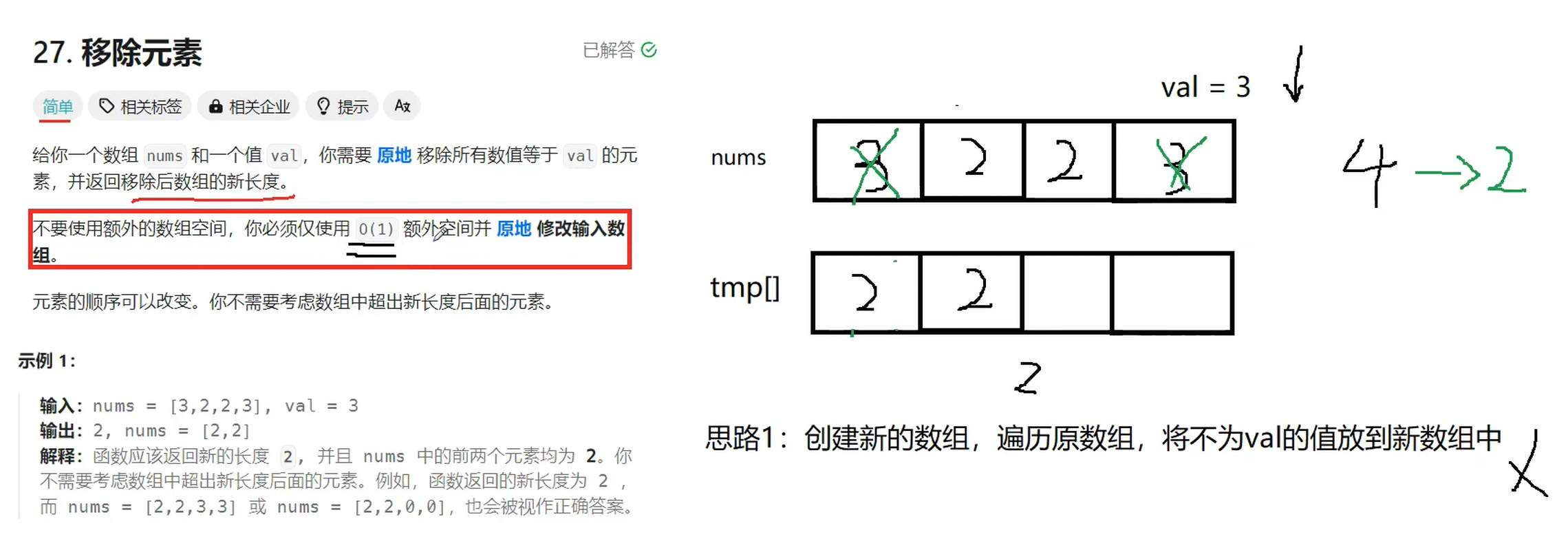 思路一:创建新数组,遍历原数组,将不为val的值放到新数组中。