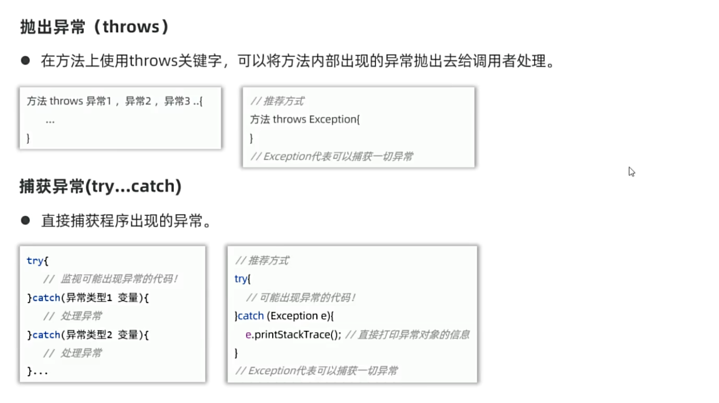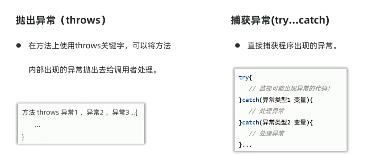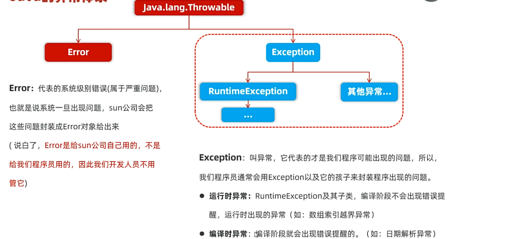 // System.out.println(str.charAt(0));//NullPointerException}//定义一个方法认识编译异常public static void show1() throws ParseException, FileNotFoundException { //抛出多个异常,用逗号隔开。可以直接抛出Exception,抛出所有异常//编译异常:编译阶段报错,编译不通过,运行时异常String str = "2025-10-31 10:10:10";//把字符串时间解析成Java中的日期对象。SimpleDateFormat sdf = new SimpleDateFormat("yyyy-MM-dd HH:mm:ss");Date date = sdf.parse(str); //编译时异常:提醒程序员这里的程序很容易出错,请你注意!System.out.println(date);//在d盘读一个图片String path = "d:\\1.jpg";FileInputStream fis = new FileInputStream(path);}