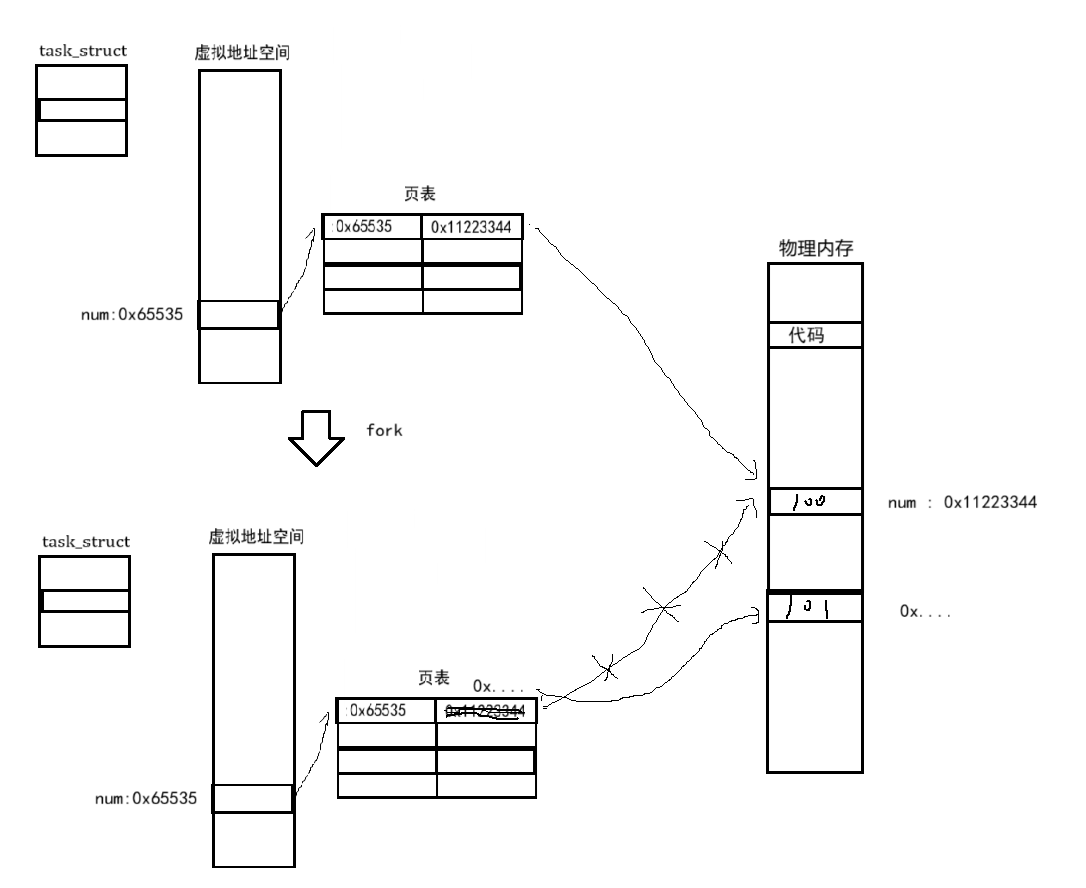 如此结构,在fork之后,子进程的PCB会浅拷贝父进程的PCB。使得父子进程都有一个指向一个物理地址的num。