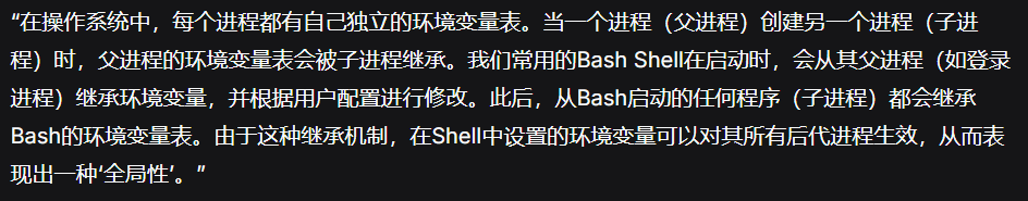 结论:正是这种 “父进程设置,子进程继承” 的机制,使得环境变量具有了影响后续所有程序的“全局属性”。”