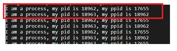 且第二个process的ppid就是18962(17655是bash的pid)。所以第一个进程是第二个进程的父进程。这里会发现父子进程在同时执行相同的代码,打印各自的pid与ppid。