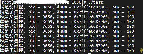 #include<sys/types.h>int main(){int num = 100;pid_t id = fork();if(id == 0){int ct = 5;while(ct--){printf("我是子进程,pid = %d, &num = %p, num = %d\n", getpid(), &num, ++num);}}else if(id > 0){int ct = 5;while(ct--){printf("我是父进程,pid = %d, &num = %p, num = %d\n", getpid(), &num, num);}}return 0;
