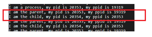 #include<unistd.h>void main(){printf("I am a process, my pid is %d, my ppid is %d\n", getpid(), getppid());pid_t id = fork();while(1){if(id<0){perror("fork");return;}else if(id == 0){printf("I am the child, my pid is %d, my ppid is %d\n", getpid(), getppid());}else{printf("I am the parent, my pid is %d, my ppid is %d\n", getpid(), getppid());}sleep(1);