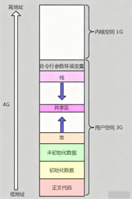 在我们学习语言时,都会学到的内存分布,代码段、数据段、堆区、共享区、栈区。