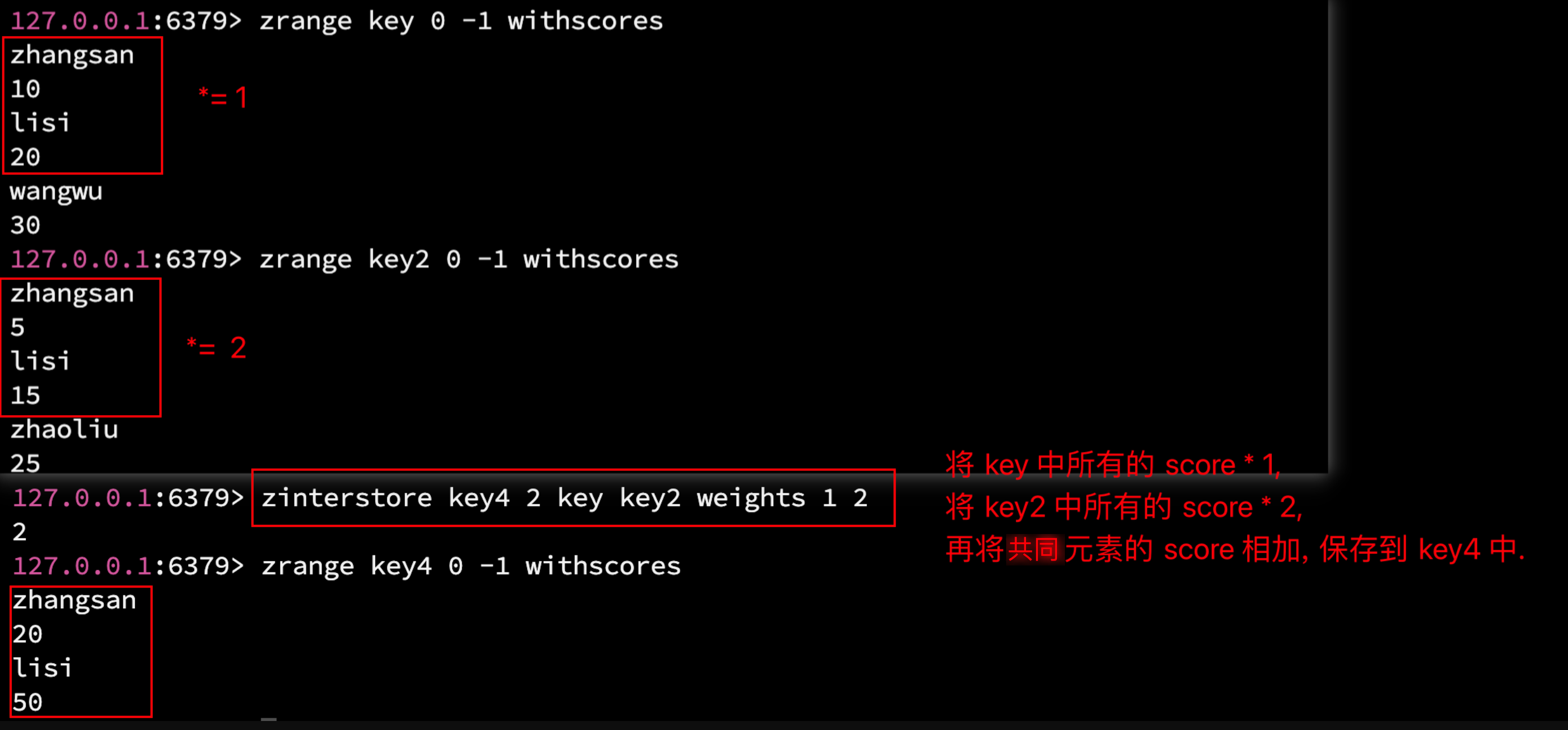- WEIGHTS: 权重/系数. 可选项, 给每个有序集合指定一个权重(按顺序和前面的 key 一一对应), 每个成员的 score 都会乘以其对应的权重.
