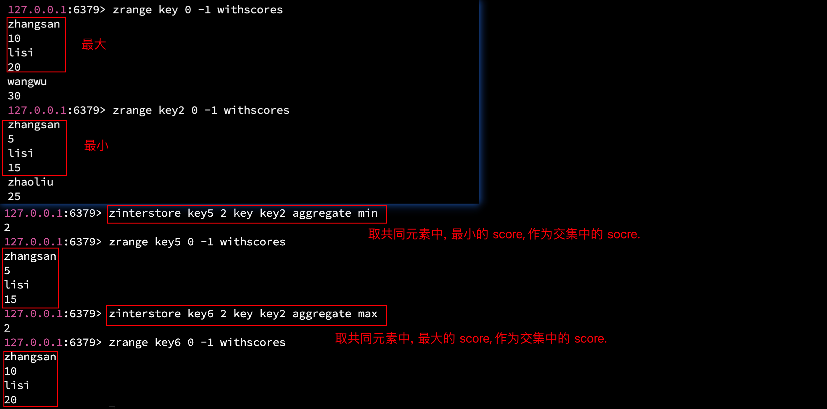 - AGGREGATE: 交集操作选出了共同的成员, 但是这些共同成员的 socre 是各不相同的, 因此最终交集中的成员的 socre 是不确定的, 而 AGGREGATE 则负责处理这些共同成员的分数.