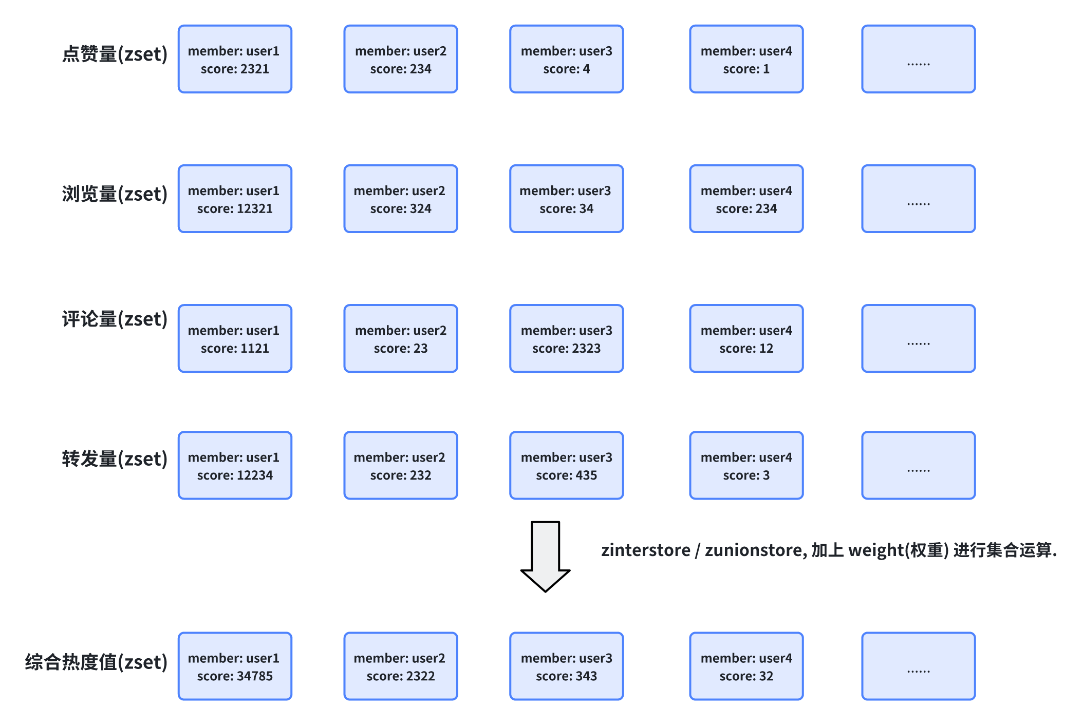 因此, 可以把 浏览量/点赞量/转发量/评论量 都各自存入一个 zset 中, member 就是 userId, socre 就是各自维度的值, 再通过 zinterstore / zunionstore 按照一定的权重, 进行一个集合间运算, 生成的新集合中的 score, 就是最终的热度值. (并且 zset 也自动进行升序排序, 顺带把排行榜也搞出来了)