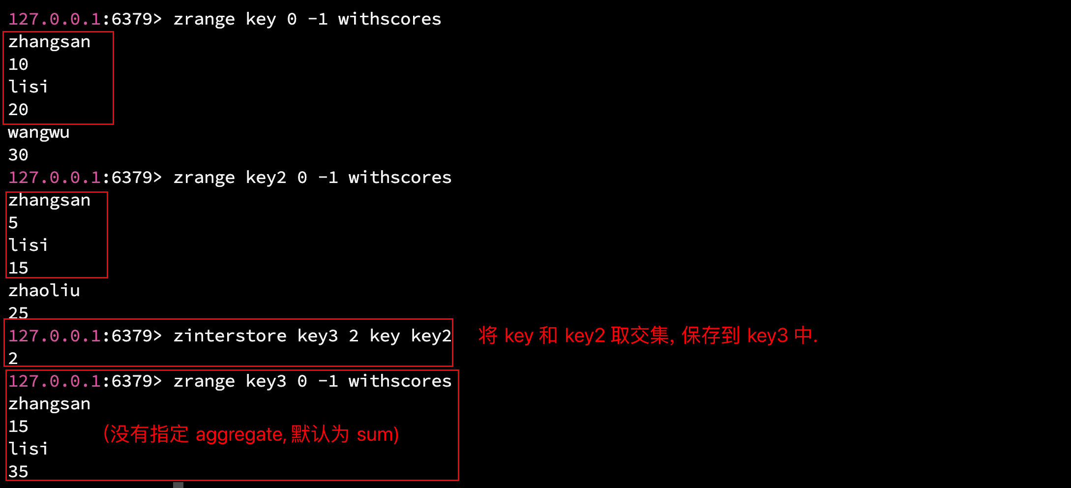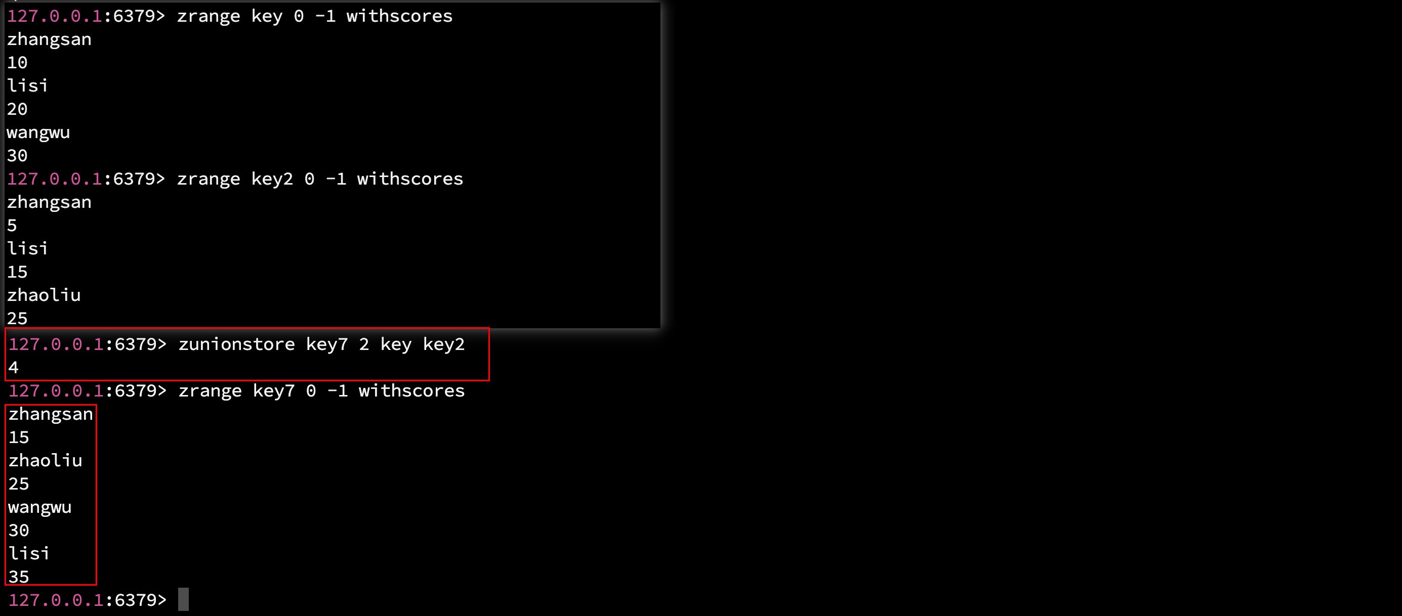 zunionstore 和 zinterstore 的用法一致, 只不过是求并集.