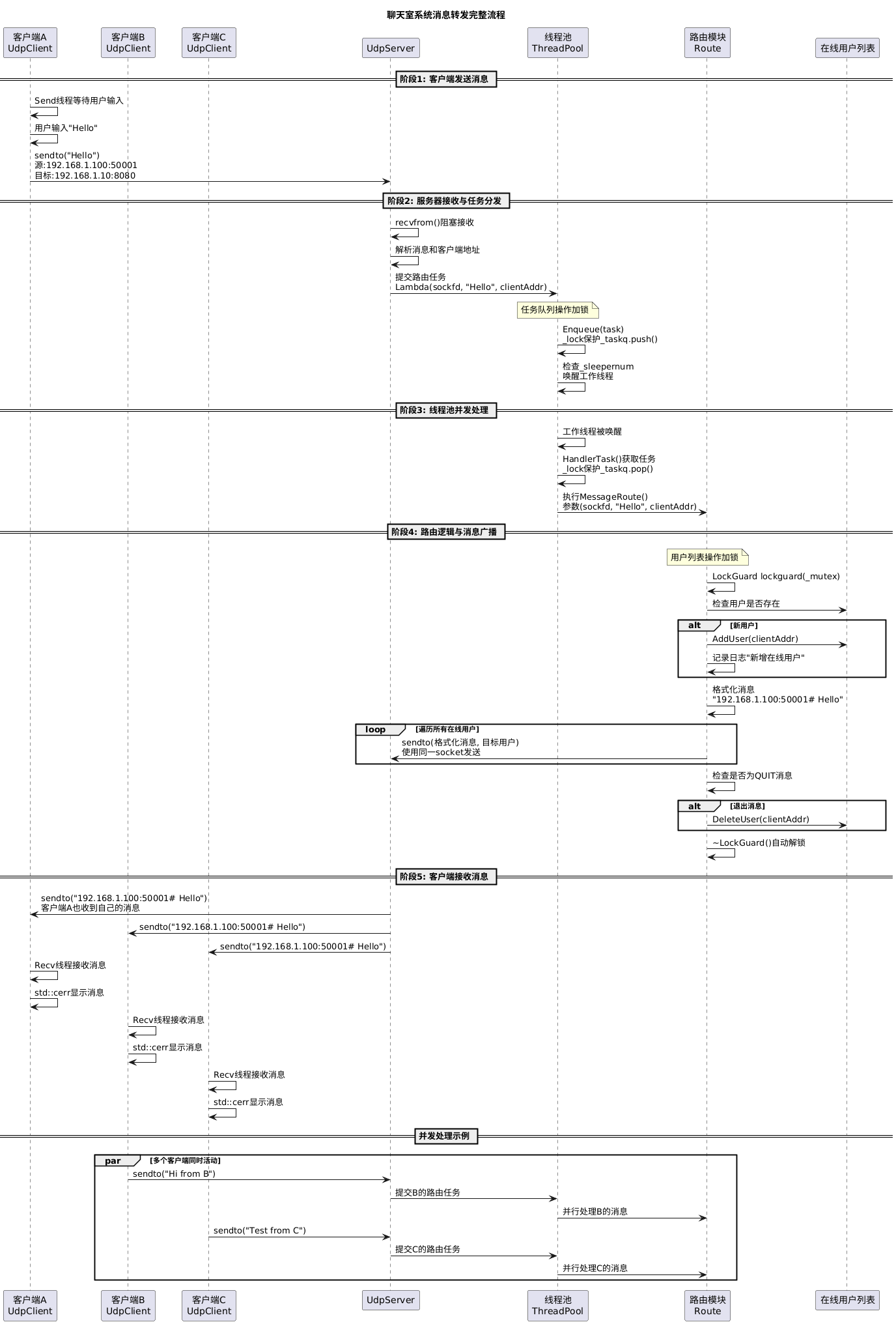 void MessageRoute(int sockfd, const std::string &message, InetAddr &peer) {LockGuard lockguard(_mutex); // 保护在线用户列表// 1. 用户上线检测if (!IsExist(peer)) {AddUser(peer); // 添加到在线列表LOG(LogLevel::INFO) << "新增在线用户: " << peer.StringAddr();}// 2. 消息格式化std::string send_message = peer.StringAddr() + "# " + message;// 结果: "192.168.1.100:50001# Hello"// 3. 广播给所有在线用户for (auto &user : _online_user) {sendto(sockfd, send_message.c_str(), send_message.size(), 0,(const struct sockaddr *)&(user.NetAddr()), sizeof(user.NetAddr()));}// 4. 用户退出处理if (message == "QUIT") {DeleteUser(peer);}