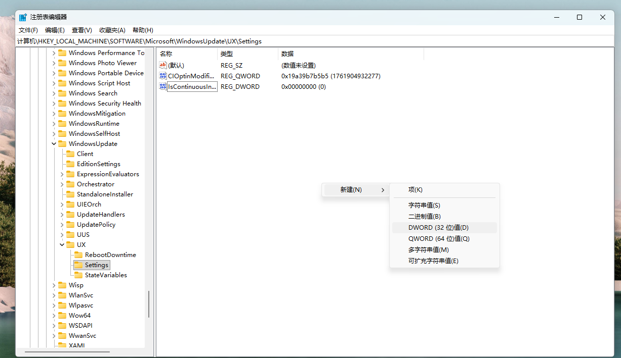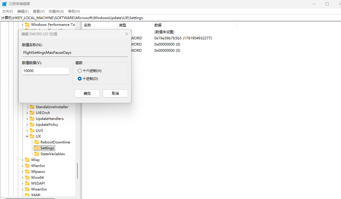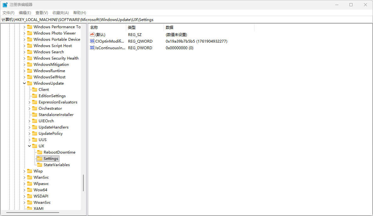 计算机\HKEY_LOCAL_MACHINE\SOFTWARE\Microsoft\WindowsUpdate\UX\Settings