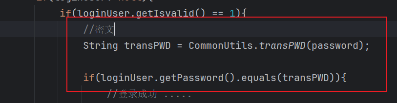 //传入明文 转出密文public static String transPWD(String pwd){String transPWD ="";try {MessageDigest md5 = MessageDigest.getInstance("MD5");md5.update(pwd.getBytes());transPWD = new BigInteger(1, md5.digest()).toString(16);} catch (NoSuchAlgorithmException e) {throw new RuntimeException(e);}return transPWD;