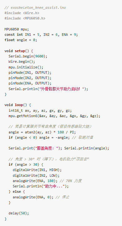 目标:当你弯膝时,电机帮你“顶回去”,模拟膝关节助力。