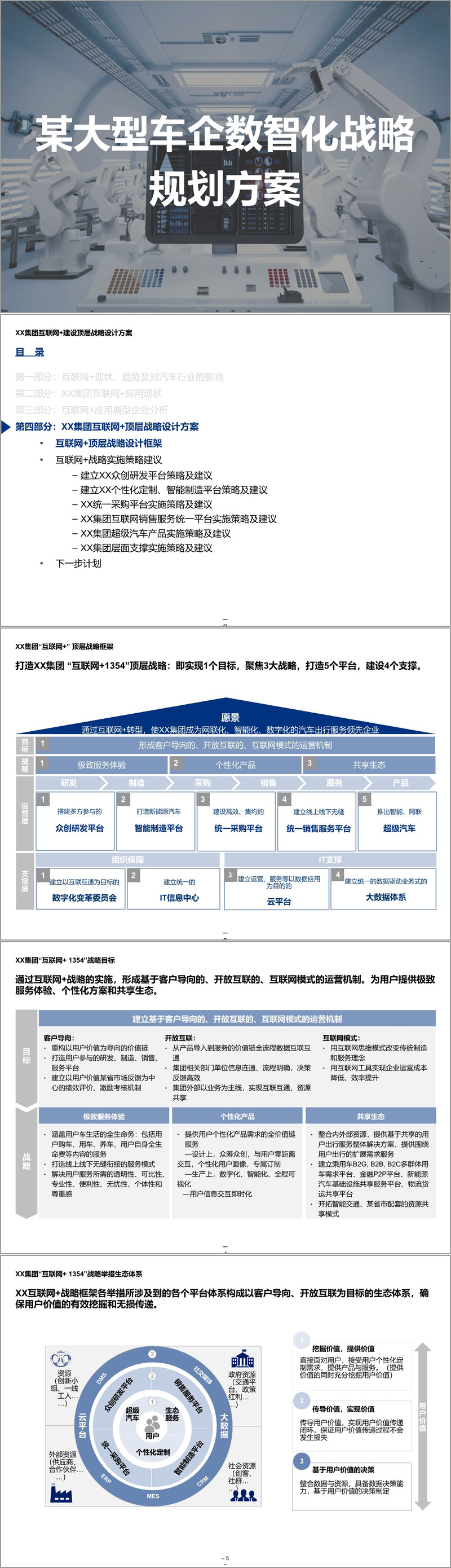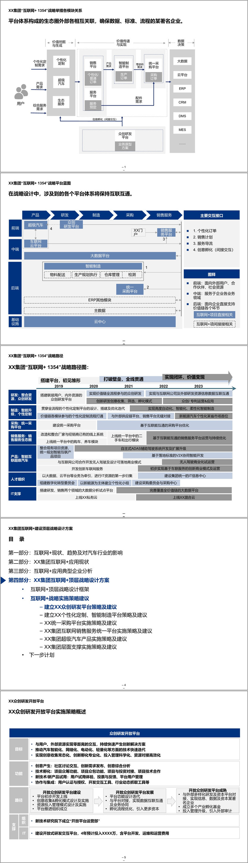 方案开篇明确战略愿景与框架,“1354” 战略即实现 1 个核心目标(构建客户导向、开放互联、互联网模式的运营机制),聚焦 3 大战略方向(极致服务体验、个性化产品、共享生态),打造 5 大核心平台(众创研发、个性化定制与智能制造、统一采购、互联网销售服务、超级汽车),建设 4 大支撑体系(大数据体系、数字化变革委员会、统一 IT 信息中心、云平台)。通过这一框架,集团可实现全价值链数据互通,推动研发、制造、采购、销售等环节协同升级。