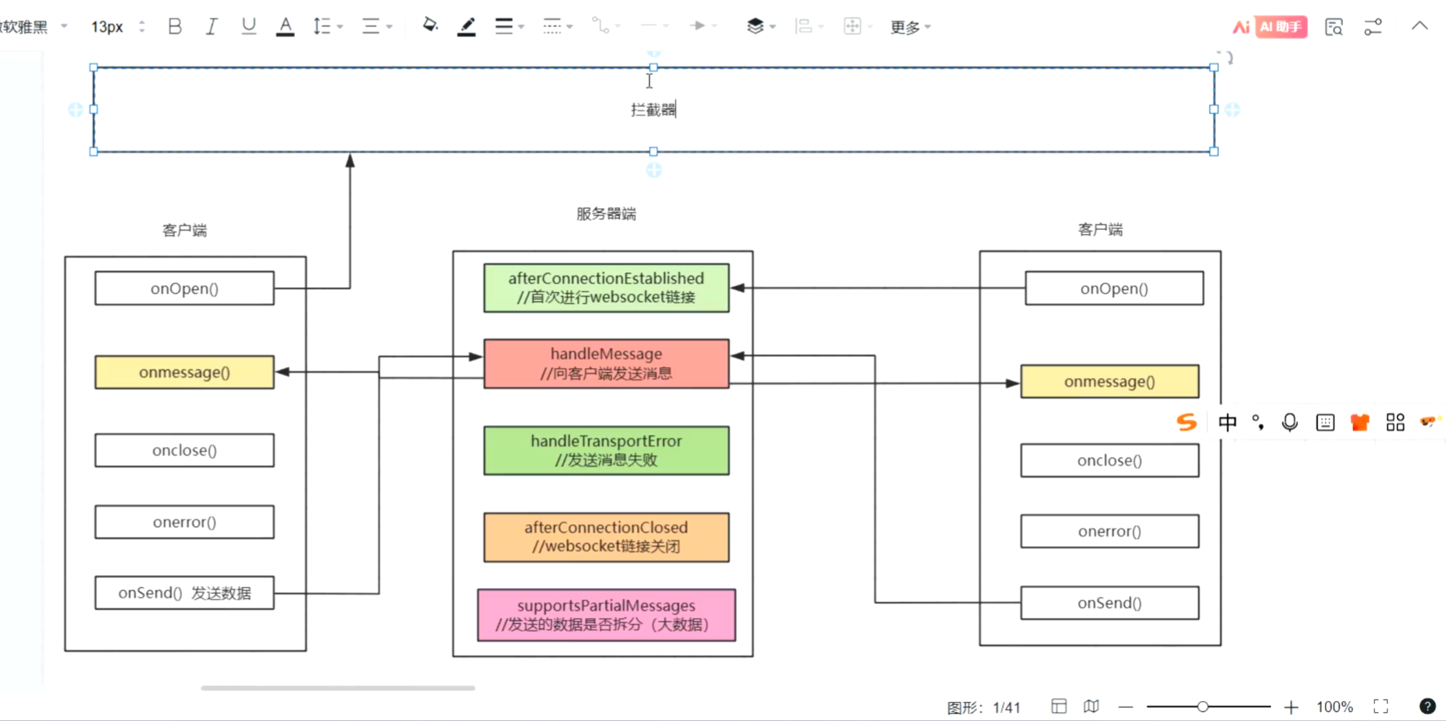 public class ChatHandler implements WebSocketHandler {// 保存所有用户连接会话public static final Map<String, WebSocketSession> USER_SOCKET_SESSION = new HashMap<>();/*** 连接建立成功回调*/@Overridepublic void afterConnectionEstablished(WebSocketSession session) throws Exception {USER_SOCKET_SESSION.put(session.getId(), session);System.out.println("用户连接成功,会话ID: " + session.getId());}/*** 处理接收到的消息*/@Overridepublic void handleMessage(WebSocketSession session, WebSocketMessage<?> message) throws Exception {String payload = message.getPayload().toString();System.out.println("接收到消息: " + payload);// 反序列化消息Message msg = GsonUtils.fromJson(payload, Message.class);// 根据消息类型进行不同处理if ("All".equals(msg.getTo())) {// 群发消息sendMessageToAll(msg);} else {// 私聊消息sendMessageToUser(msg.getTo(), msg);}}/*** 群发消息给所有用户*/public void sendMessageToAll(Message message) throws IOException {for (WebSocketSession session : USER_SOCKET_SESSION.values()) {if (session.isOpen()) {session.sendMessage(new TextMessage(GsonUtils.toJson(message)));}}}/*** 发送消息给指定用户*/public void sendMessageToUser(String userId, Message message) throws IOException {WebSocketSession session = USER_SOCKET_SESSION.get(userId);if (session != null && session.isOpen()) {session.sendMessage(new TextMessage(GsonUtils.toJson(message)));}}/*** 处理传输错误*/@Overridepublic void handleTransportError(WebSocketSession session, Throwable exception) throws Exception {System.out.println("连接出错: " + exception.getMessage());USER_SOCKET_SESSION.remove(session.getId());if (session.isOpen()) {session.close();}}/*** 连接关闭回调*/@Overridepublic void afterConnectionClosed(WebSocketSession session, CloseStatus closeStatus) throws Exception {USER_SOCKET_SESSION.remove(session.getId());System.out.println("用户断开连接,会话ID: " + session.getId());}@Overridepublic boolean supportsPartialMessages() {return false;}