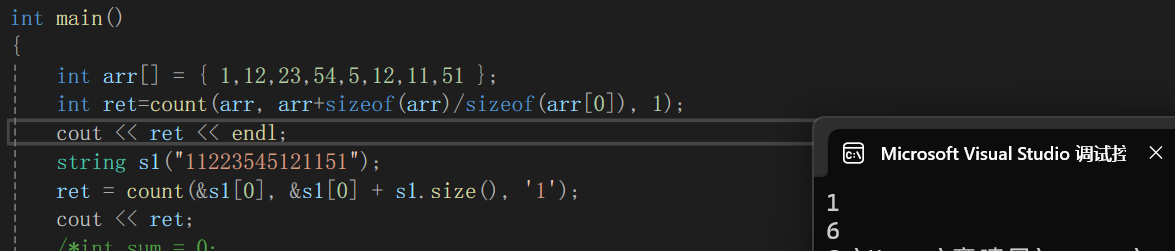 {int arr[] = { 1,12,23,54,5,12,11,51 };int ret=count(arr, arr+sizeof(arr)/sizeof(arr[0]), 1);cout << ret << endl;string s1("11223545121151");ret = count(&s1[0], &s1[0] + s1.size(), '1');cout << ret;