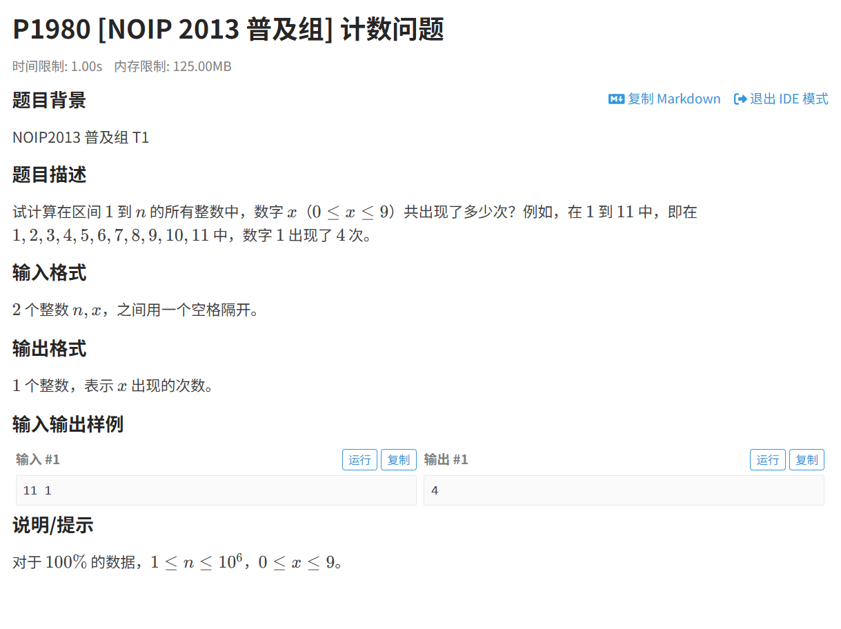 {int n,x;cin>>n>>x;int total=0;for(int i=1;i<=n;i++){string s1=to_string(i);//把每个数字都转成string,这样我们就能用count函数帮我们统计个数total+=count(s1.begin(),s1.end(),x+'0');}cout<<total;return 0;