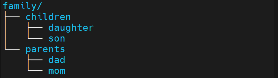 mkdir -p family/parents/dad mkdir -p family/parents/mom mkdir -p family/children/son mkdir -p family/children/daughter# 一条命令完成搭建 mkdir -p family/parents/{dad,mom} family/children/{son,daughter}# 删除整个目录(非常麻烦,后面我们介绍简洁方便的删除方式) rmdir family/parents/dad rmdir family/parents/mom rmdir family/children/son rmdir family/children/daughter rmdir family/parents rmdir family/children rmdir family