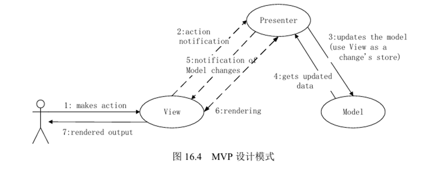在MVP模式中Model提供数据,View负责显示,Controller/Presenter负责逻辑的处理。MVP 不仅仅避免了View和Model之间的耦合,还进一步降低了Presenter对View的依赖。MVP设计模 式如图16.4所示。