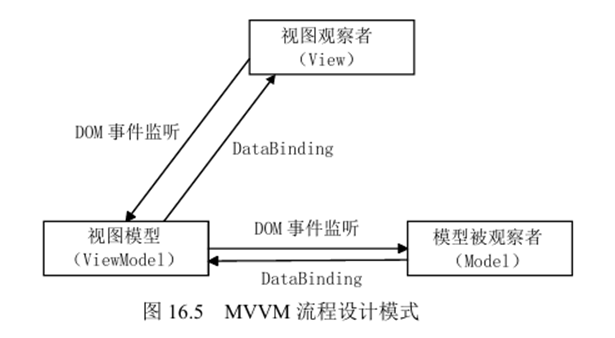 MVVM和MVC、MVP类似,主要目的都是为了实现视图和模型的分离。不同的是MVVM中, View与Model的交互通过ViewModel来实现,也就是View和Model不能直接通信,两者的通信只能通过ViewModel来实现。ViewModel是MVVM的核心,通过DataBinding实现View与Model之间的 双向绑定,其内容包括数据状态处理、数据绑定及数据转换。MVVM流程设计模式如图16.5所示。