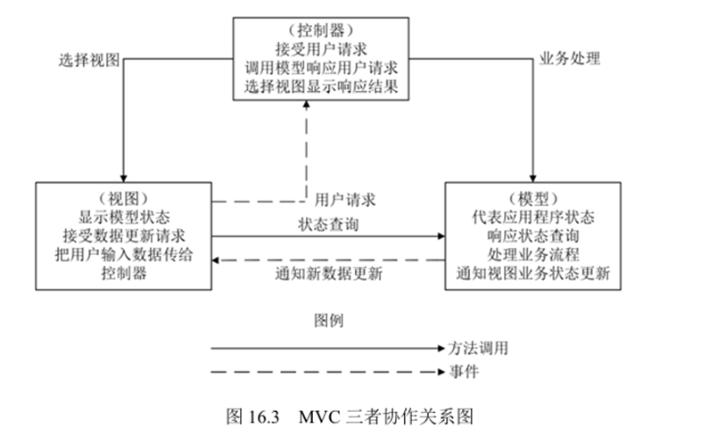 3)视图(View):用户看到并与之交流的界面。 三者协作关系如图16.3所示。