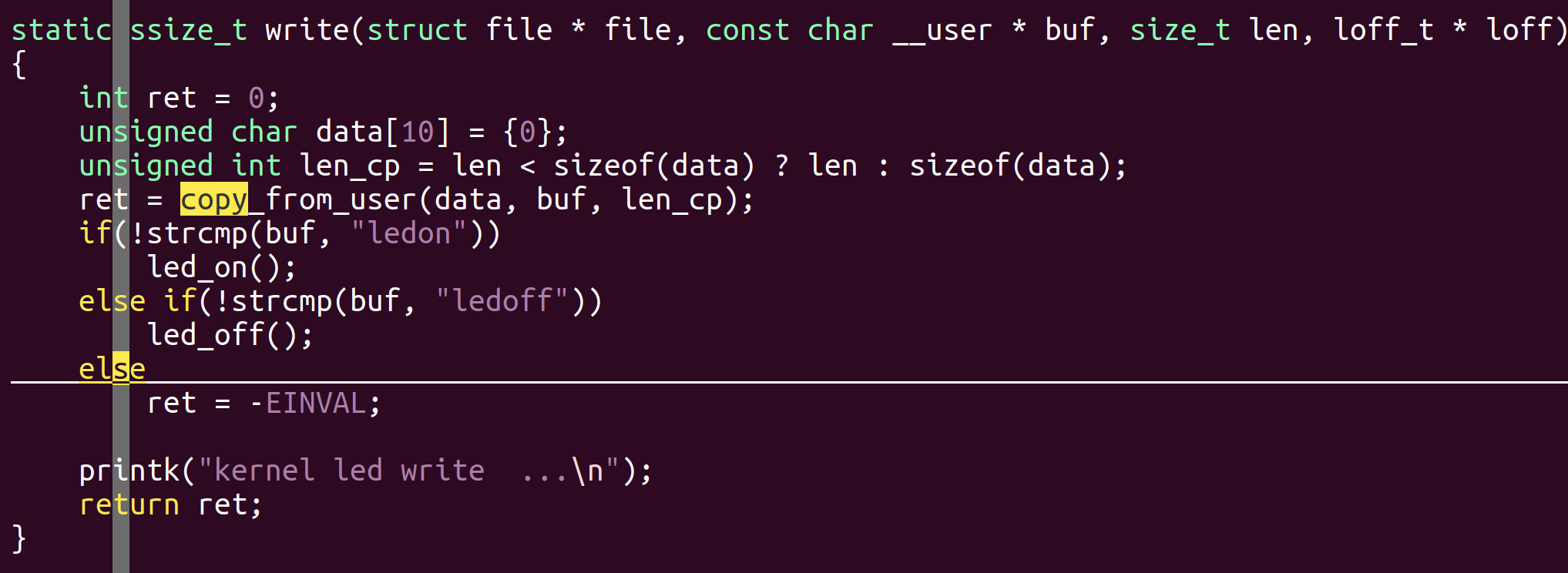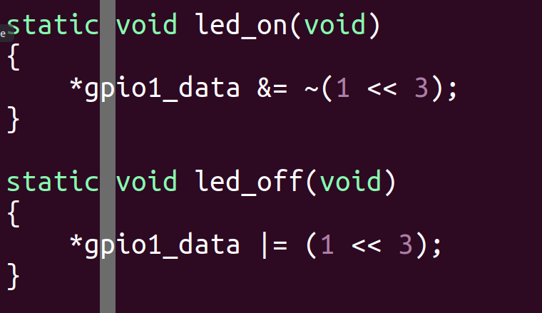 {int fd = open("/dev/led1", O_RDWR); // 调用 open 系统调用if(fd < 0) { /* 错误处理 */ }write(fd, "ledon", 5); // 调用 write 系统调用write(fd, "ledoff", 6); // 调用 write 系统调用close(fd); // 调用 close 系统调用return 0;