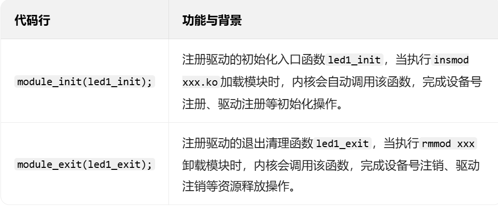 确保驱动能被内核正确加载和卸载,是字符设备驱动(如示例中的 LED 驱动)模块化管理的关键实现。