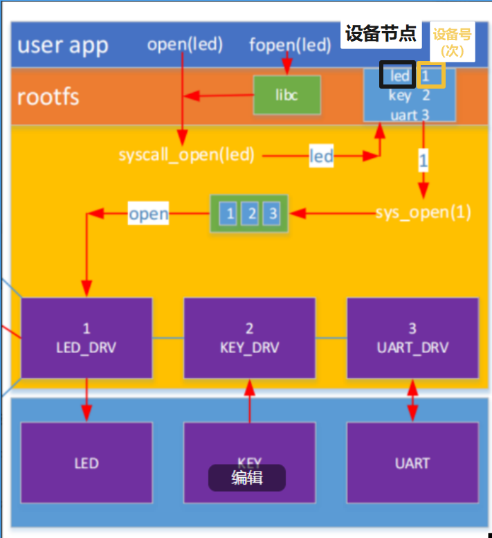syscall_open(led)将用户请求传入内核,内核通过设备号匹配对应的驱动(如 LED 驱动匹配设备号 1)。 - 内核驱动管理模块(含