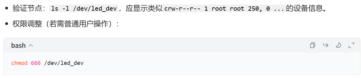 ①前提条件:开发板已运行 Linux 内核,且需知道目标设备的主设备号和次设备号(可通过内核日志dmesg或驱动代码获取)。