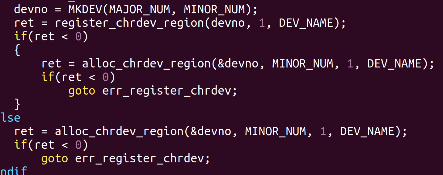 MAJOR_NUM和MINOR_NUM向内核申请设备号范围) - 动态注册:alloc_chrdev_region(如果静态省请未成功,系统自动分配一个未被占用的设备号)