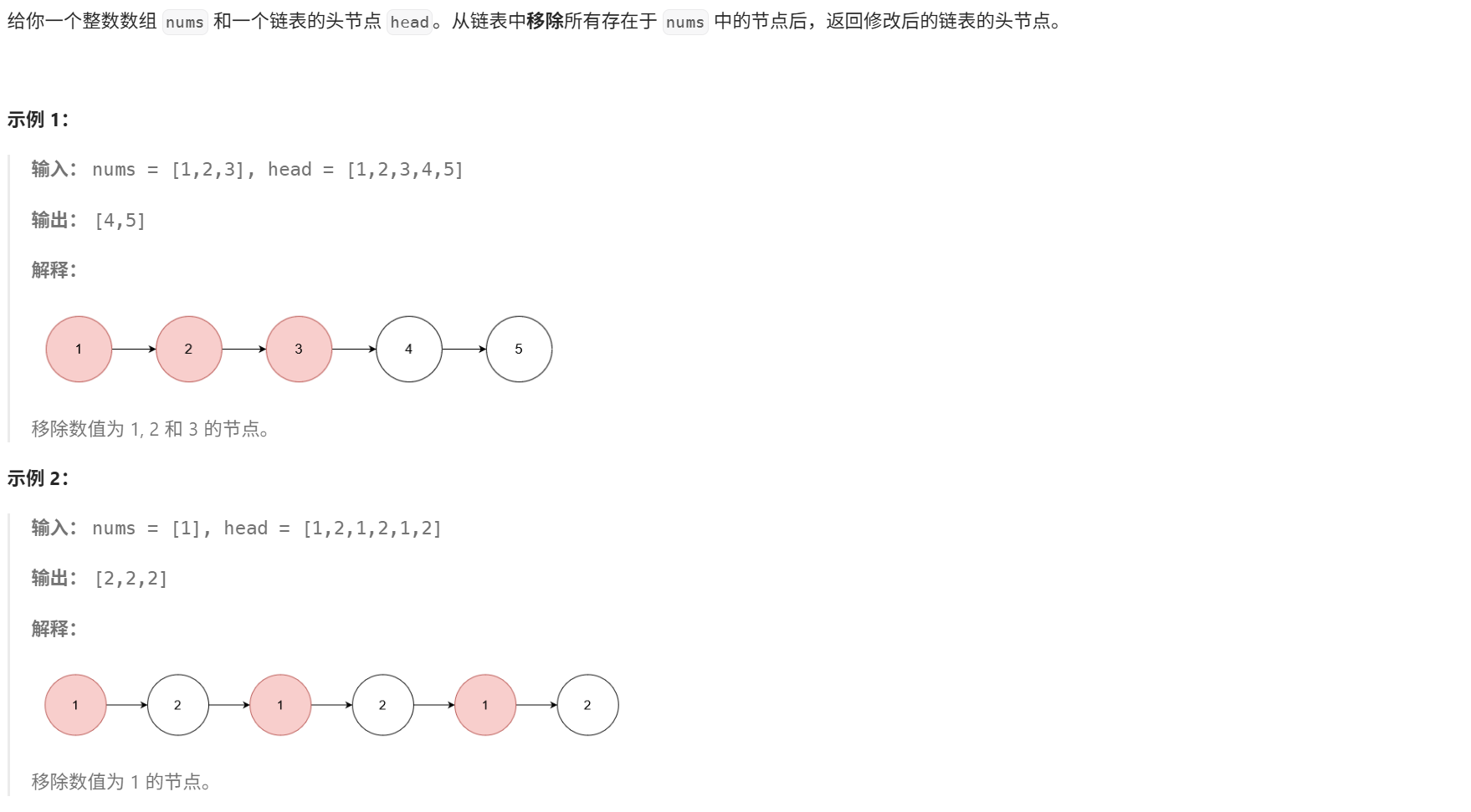 public:ListNode* modifiedList(vector<int>& nums, ListNode* head) {//将nums中的元素加入哈希表unordered_map<int,bool> hash;for(auto x:nums) hash[x]=true;//引入虚拟头节点ListNode newhead(0);newhead.next=head;ListNode* pre=&newhead;ListNode* current=head;while(current!=nullptr){//current指向的值在nums中存在if(hash.count(current->val)>0){pre->next=current->next;//delete current;(可以不写,因为链表可能底层实现方式不能delete)current=pre->next;}else{pre=current;current=current->next;}}ListNode* ret=newhead.next;return ret;}