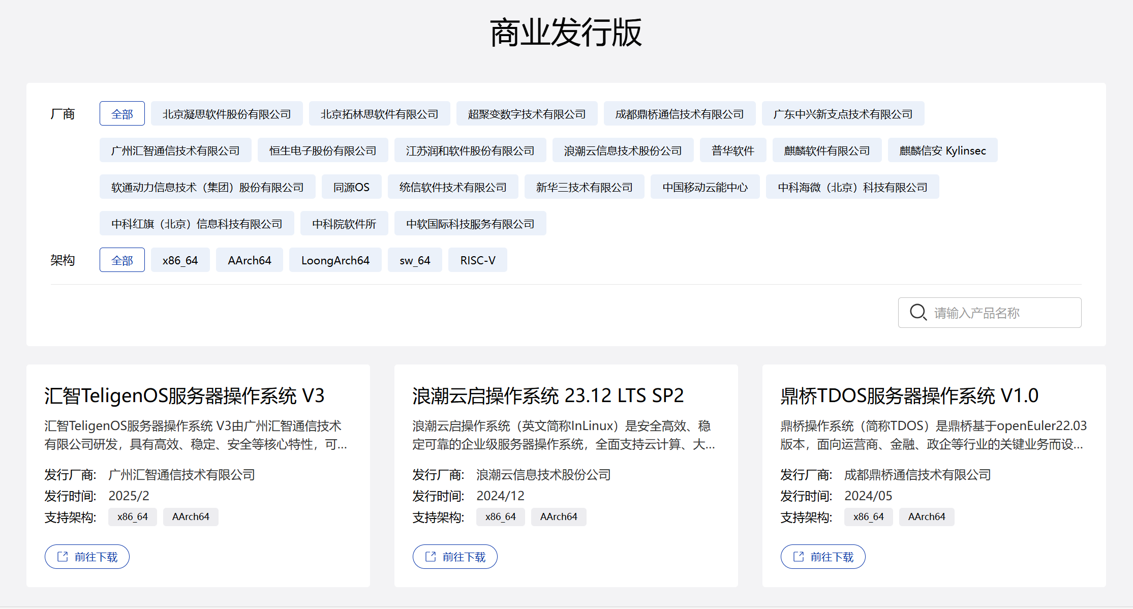 除此之外,还有许多基于 openEuler 发行的商业版本,包括北京凝思软件股份有限公司、恒生电子股份有限公司、浪潮云信息技术股份公司、普华软件、麒麟软件有限公司、统信软件技术有限公司、中科红旗(北京)信息科技有限公司、中软国际科技服务有限公司等。