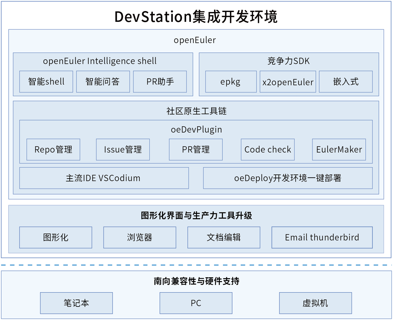 完整开发工具链:openEuler DevStation 是专为开发者设计的 Linux 桌面发行版,聚焦简化开发流程与生态兼容性,为开发者提供更加高效、安全且适应复杂场景的开发体验。