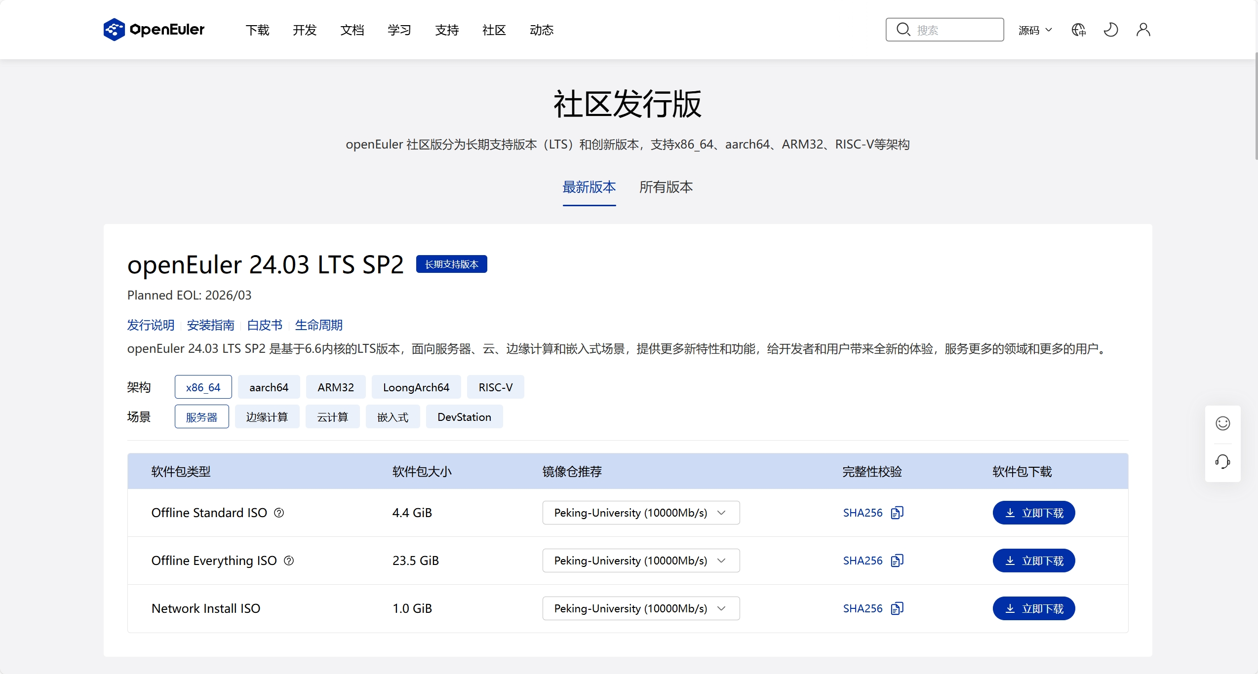 目前,最新的期支持版本为 openEuler 24.03 LTS SP2,最新的社区创新版本为 openEuler 25.03。