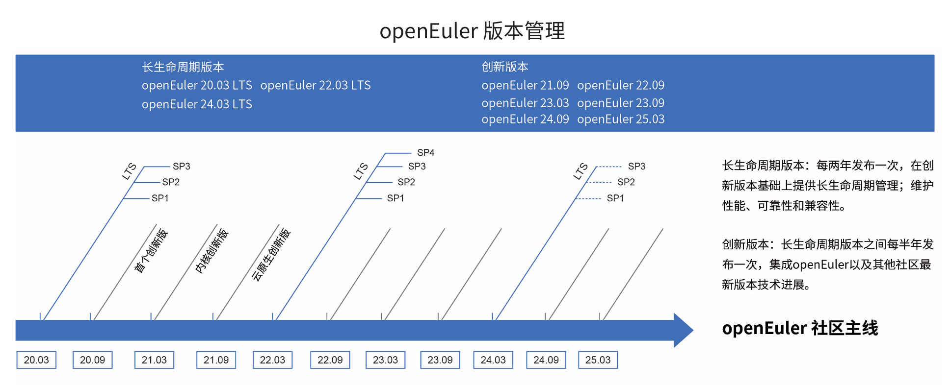 openEuler 每两年推出一个 LTS 版本,为企业级用户提供一个安全稳定可靠的操作系统。同时,openEuler 通过每半年发布一个创新版,快速集成 openEuler 以及其他社区的最新技术成果,将社区验证成熟的特性逐步回合到发行版中。