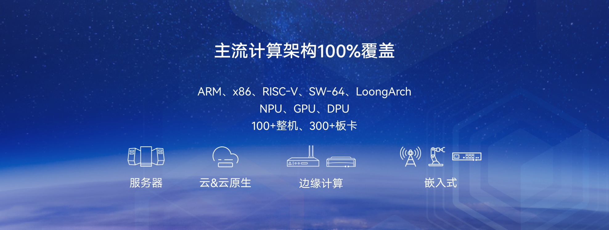- 支持多样性设备:全面支持 ARM、x86、RISC-V、loongArch、PowerPC、SW-64 等多样性计算架构。全量组件原子化,构建服务自助化。