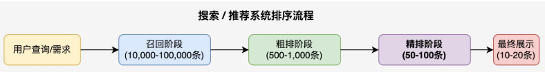 比如,短视频推荐先通过召回获取数万个可能相关视频,再通过粗排缩减至数百条,最后精排阶段会考虑用户最近的互动、视频热度、内容多样性等复杂因素,确定最终展示的10个视频及顺序。