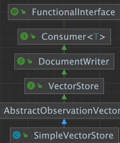 SimpleVectorStore实现了VectorStore接口,而VectorStore 接口集成了DocumentWriter,所以具备文档写入能力。如图: