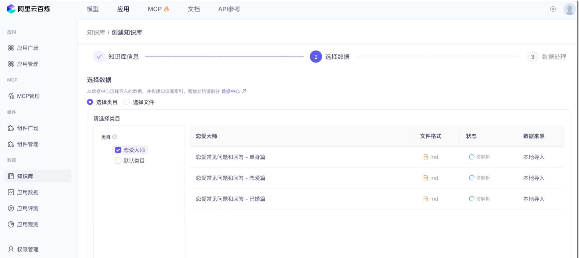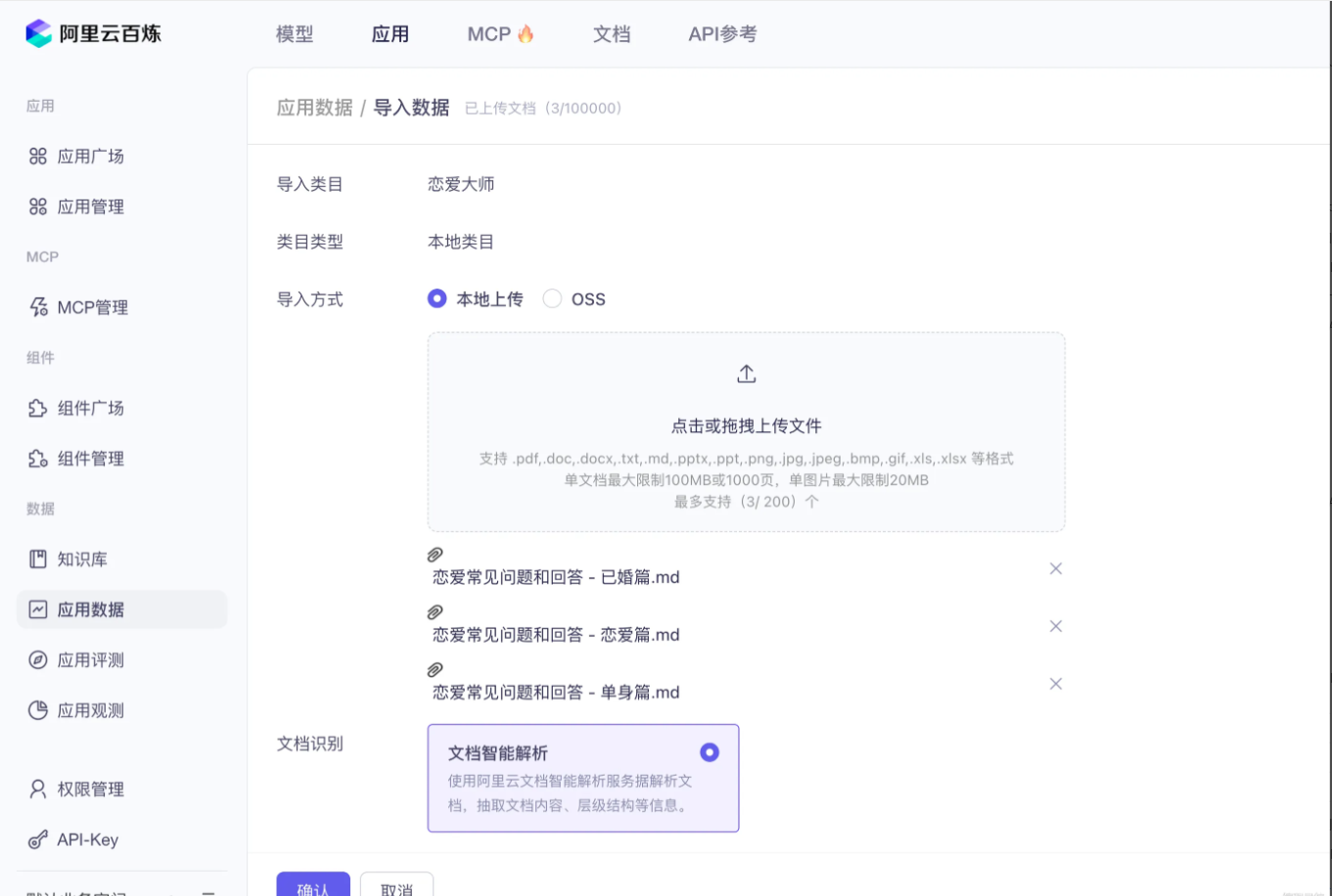 1>准备数据。在应用数据模块中,上传原始文档数据到平台,由平台来帮忙解析文档中的内容和结构。